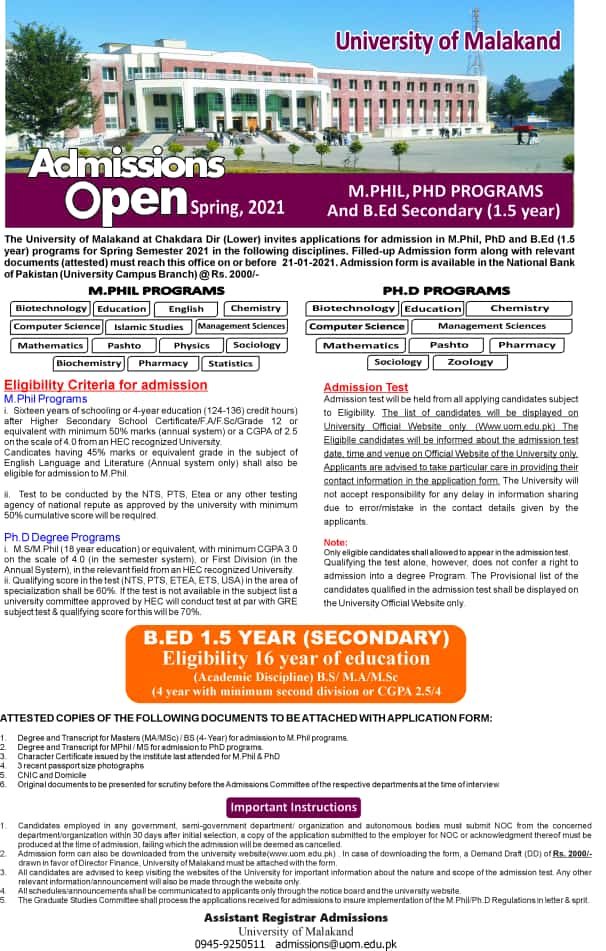 AdmissionsUniversity of Malakand Admissions (Mphil, PhD, B-Ed) 5 January 2021521FacebookTwitterPinterestWhatsApp Share to your communityShare