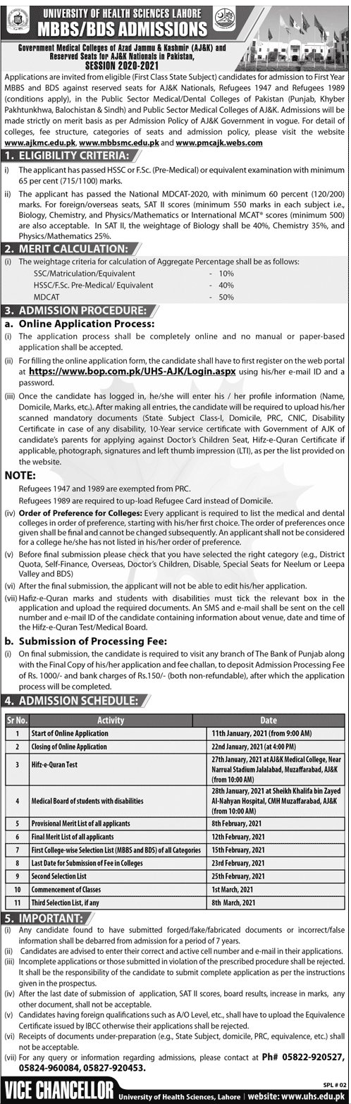 AdmissionsUHS Admission Schedule for MBBS & BDS (AJK Nationals) 2021 8 January 2021451FacebookTwitterPinterestWhatsApp Share to your communityShare