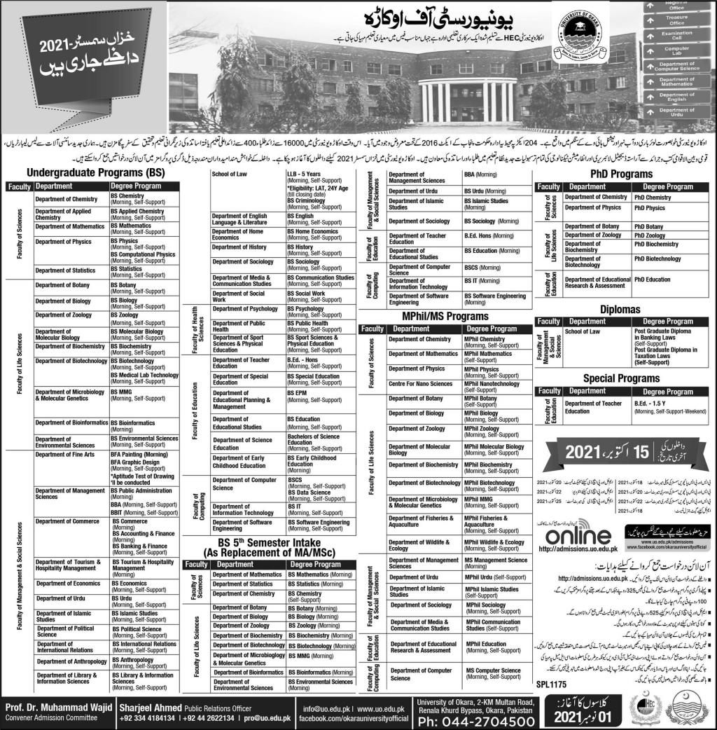 AdmissionsAdmission Open University Of Okara Fall 2021 20 September 2021497FacebookTwitterPinterestWhatsApp Share to your communityShare