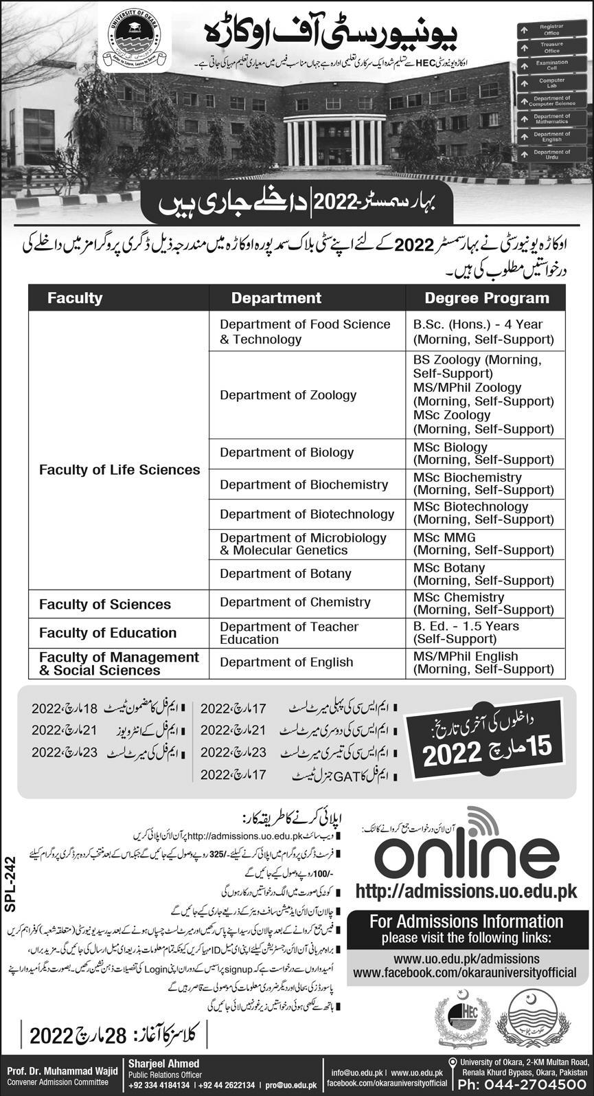 AdmissionsUniversity of Okara MPhil Admission Spring Semester 2022 26 February 2022326FacebookTwitterPinterestWhatsApp Share to your communityShare