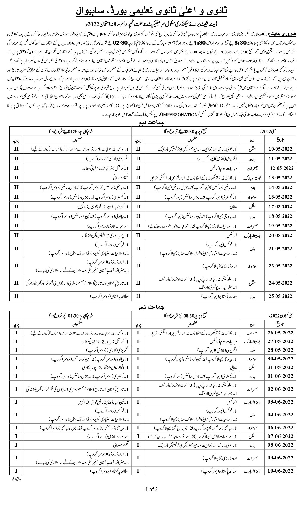 Date SheetsDate Sheet SSC (I, II) 9Th & 10Th 2022 BISE Sahiwal 9 April 2022301FacebookTwitterPinterestWhatsApp Share to your communityShare