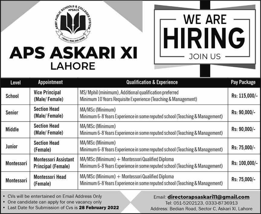 JobsTeaching Jobs in APS (Army Public Schools) 13 February 2022402FacebookTwitterPinterestWhatsApp Share to your communityShare