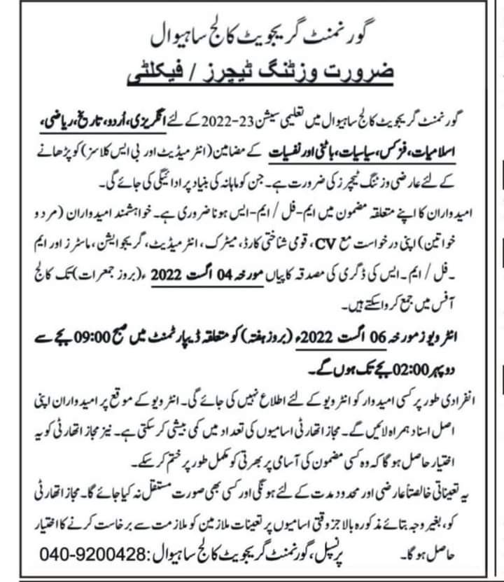 JobsVisiting Faculty Required/G-C Sahiwal 24 July 2022264FacebookTwitterPinterestWhatsApp Share to your communityShare