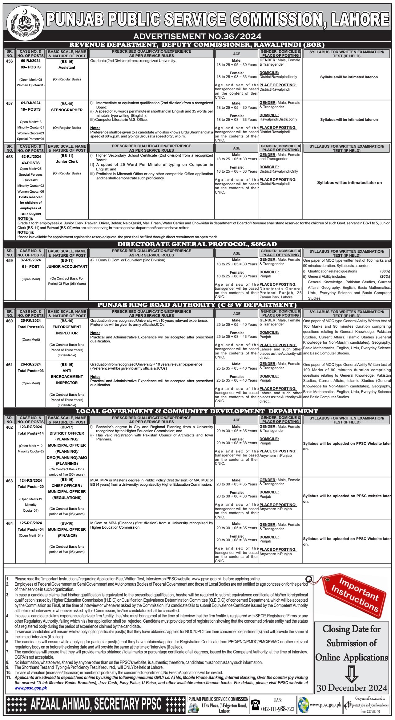 - Please read the “Important Instructions” regarding the Application Fee, Written Test, and Interview on PPSC’s website www.ppsc.gop.pk before applying online.