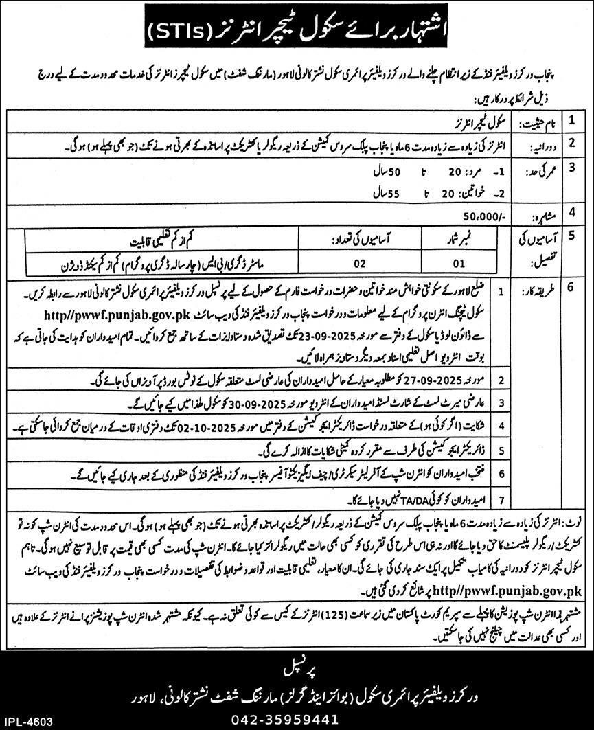 Jobs Punjab Workers Welfare Fund Schools STI (School Teacher Internees) Jobs 2025 parhaai.com - 14 September 2025 0 Punjab Workers Welfare Fund Schools STI (School Teacher Internees) Jobs 2025